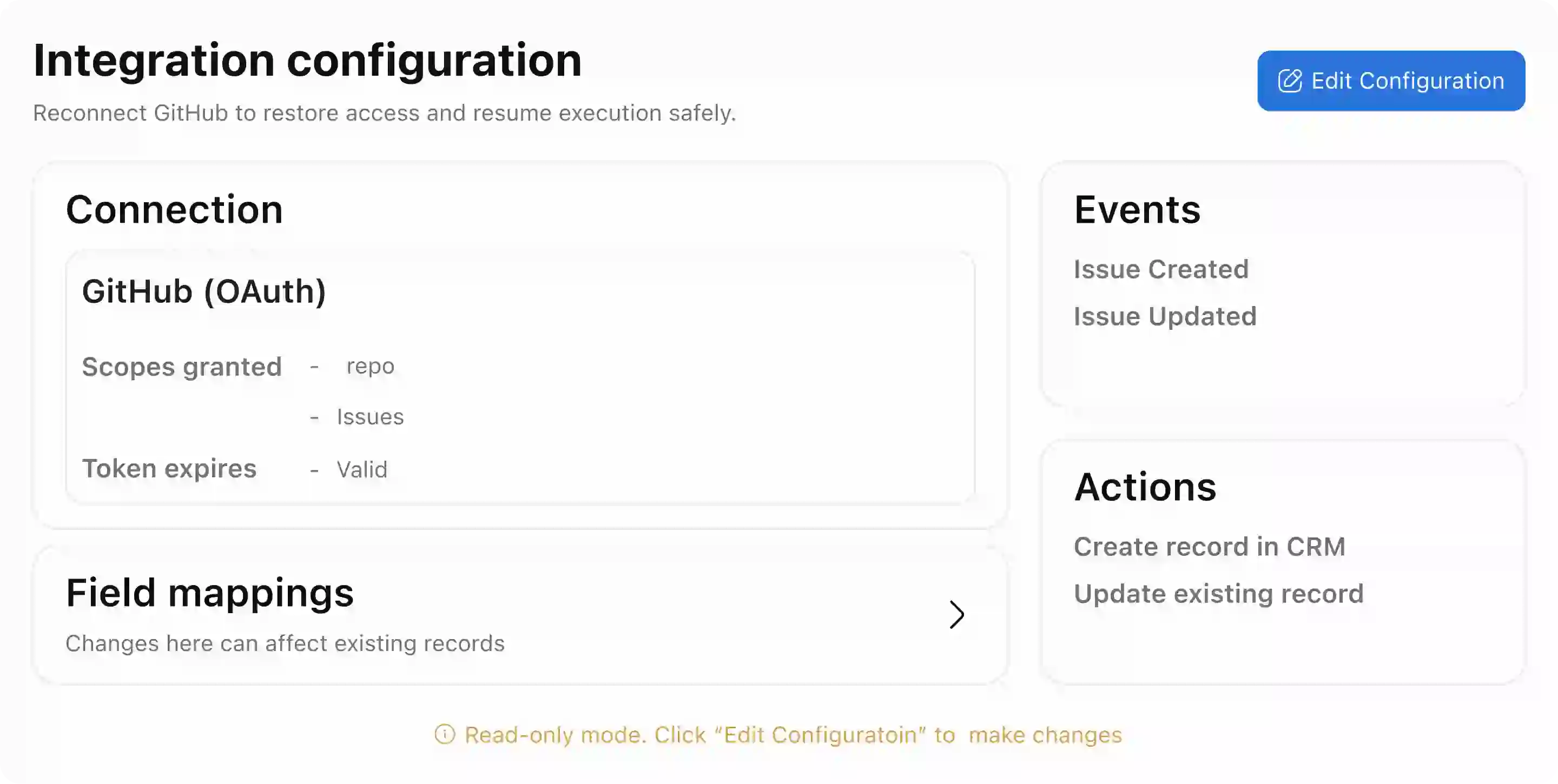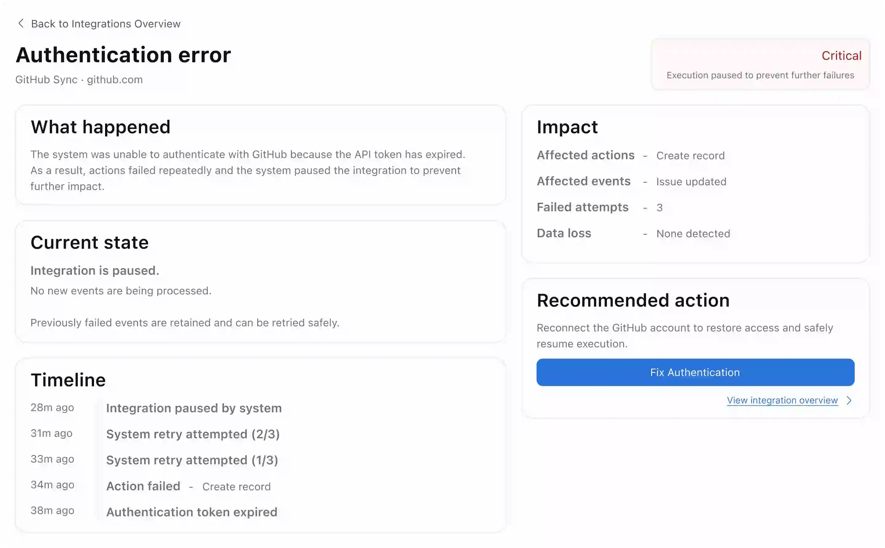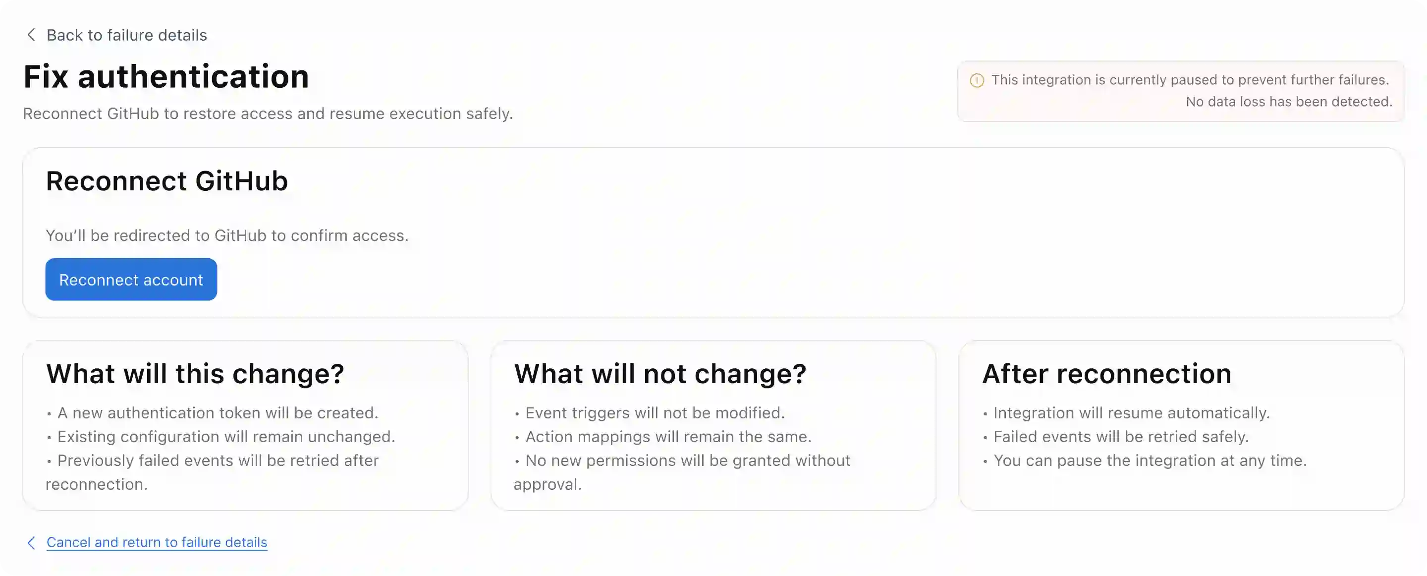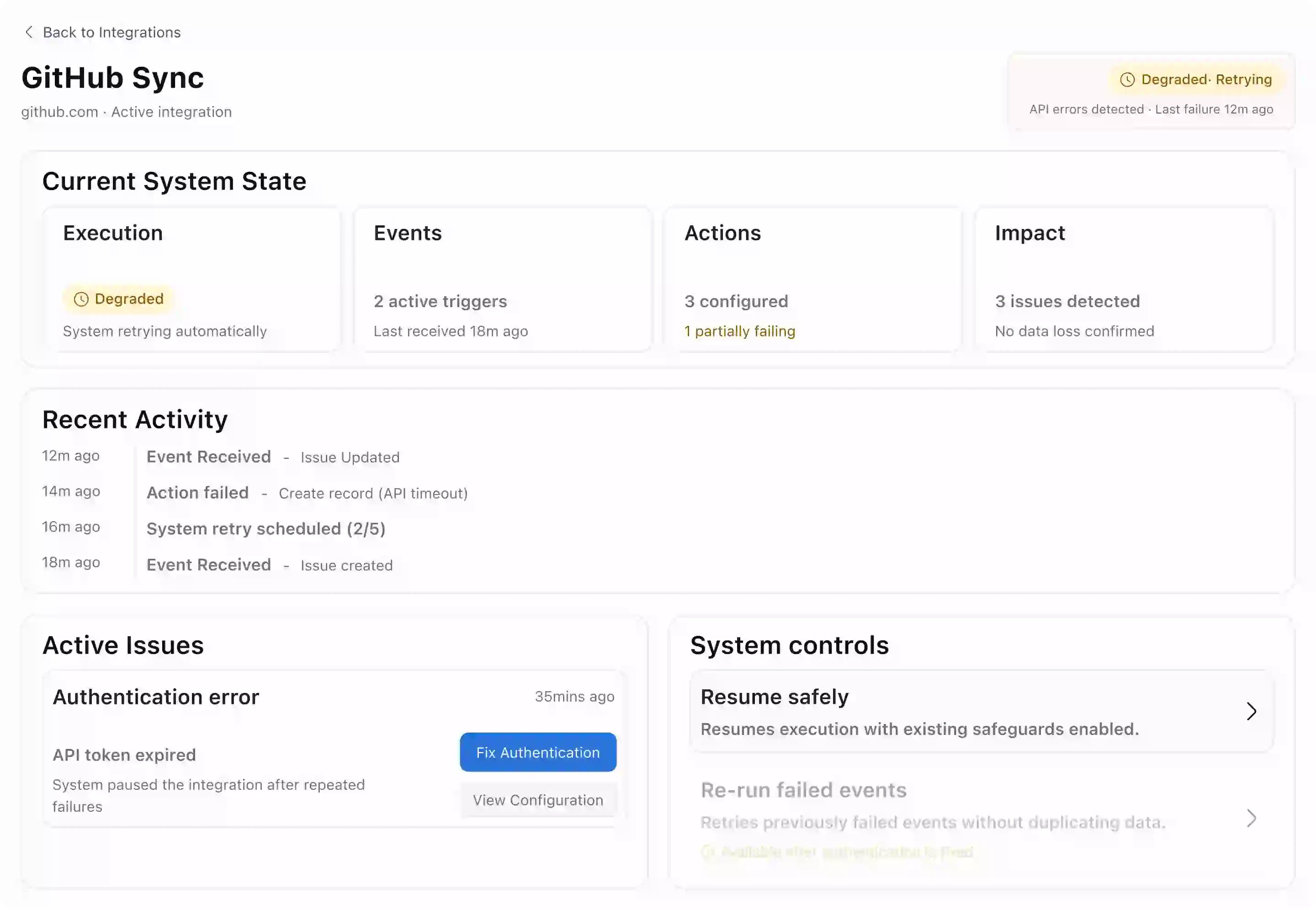 Recovery flows are issue-specific. Reconnecting auth doesn't expose trigger config. Retrying events doesn't allow editing actions. Each path addresses exactly one failure.