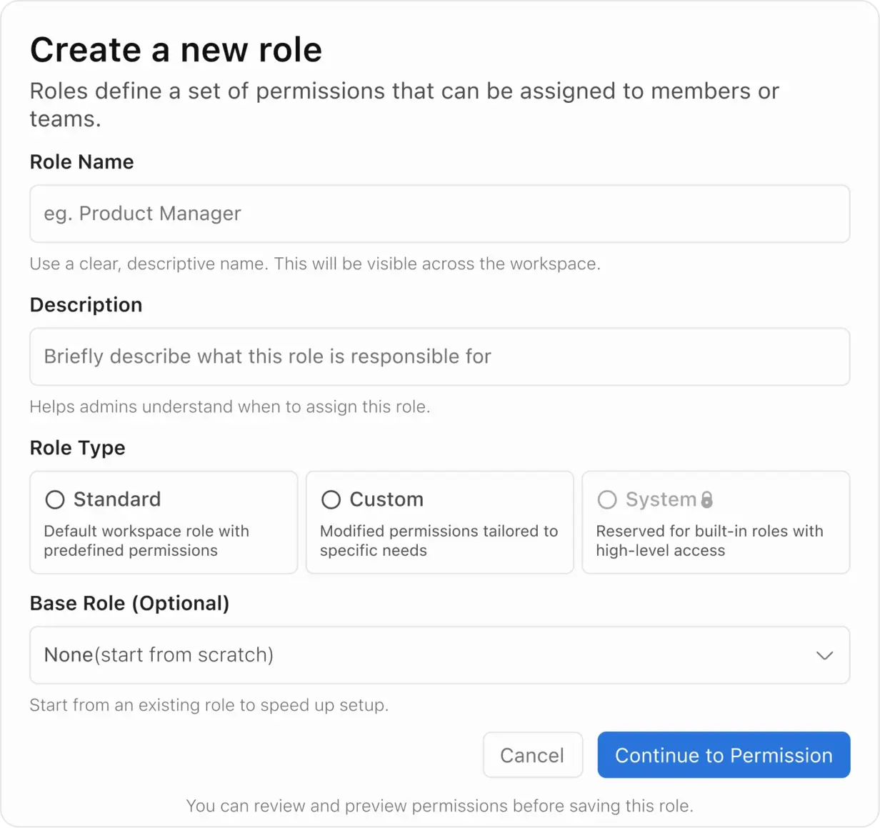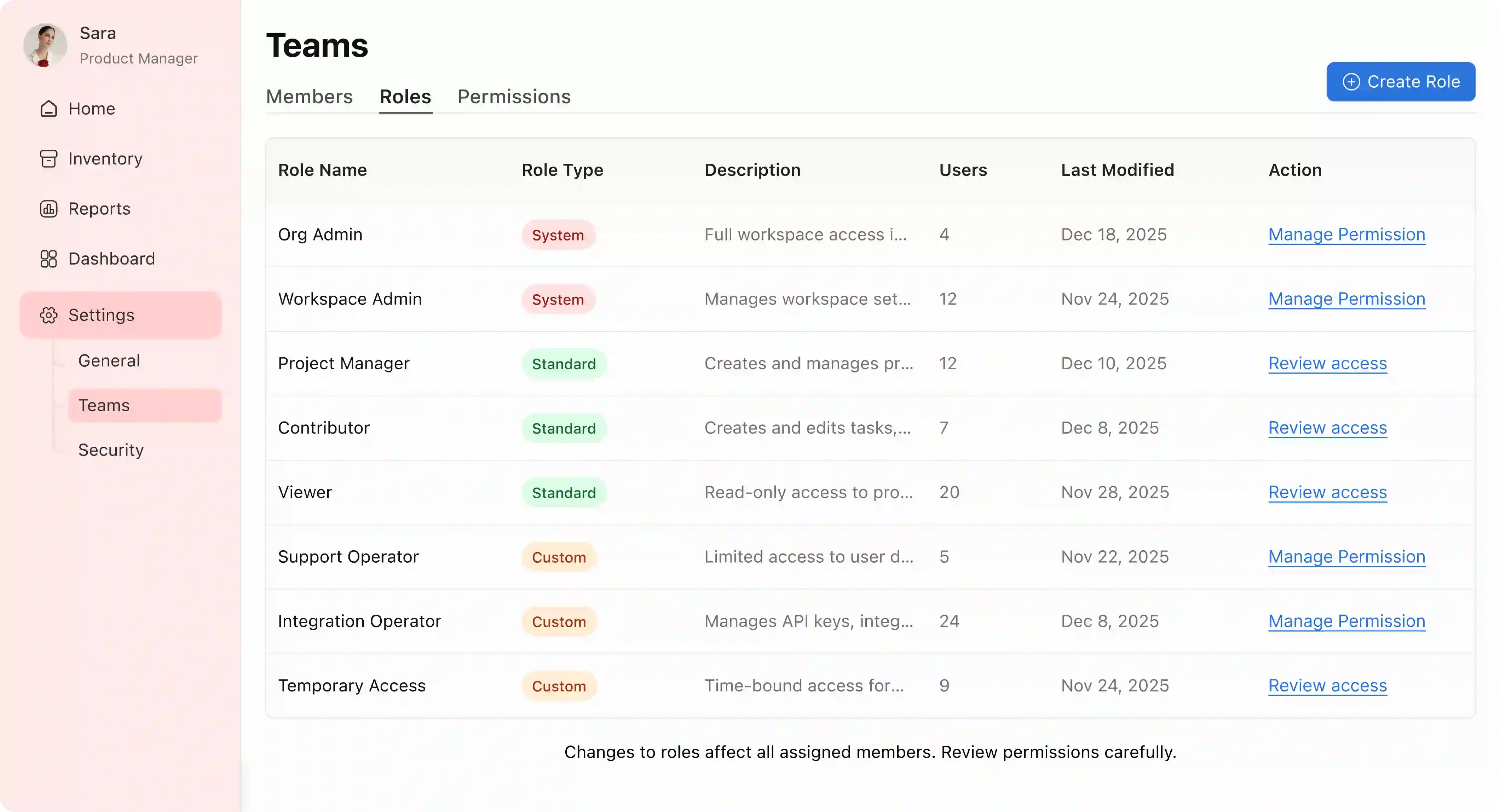 Member counts are surfaced inline, so admins understand the real-world weight of a role before touching it. High-risk System roles are read-only — deliberately trading flexibility for stability.