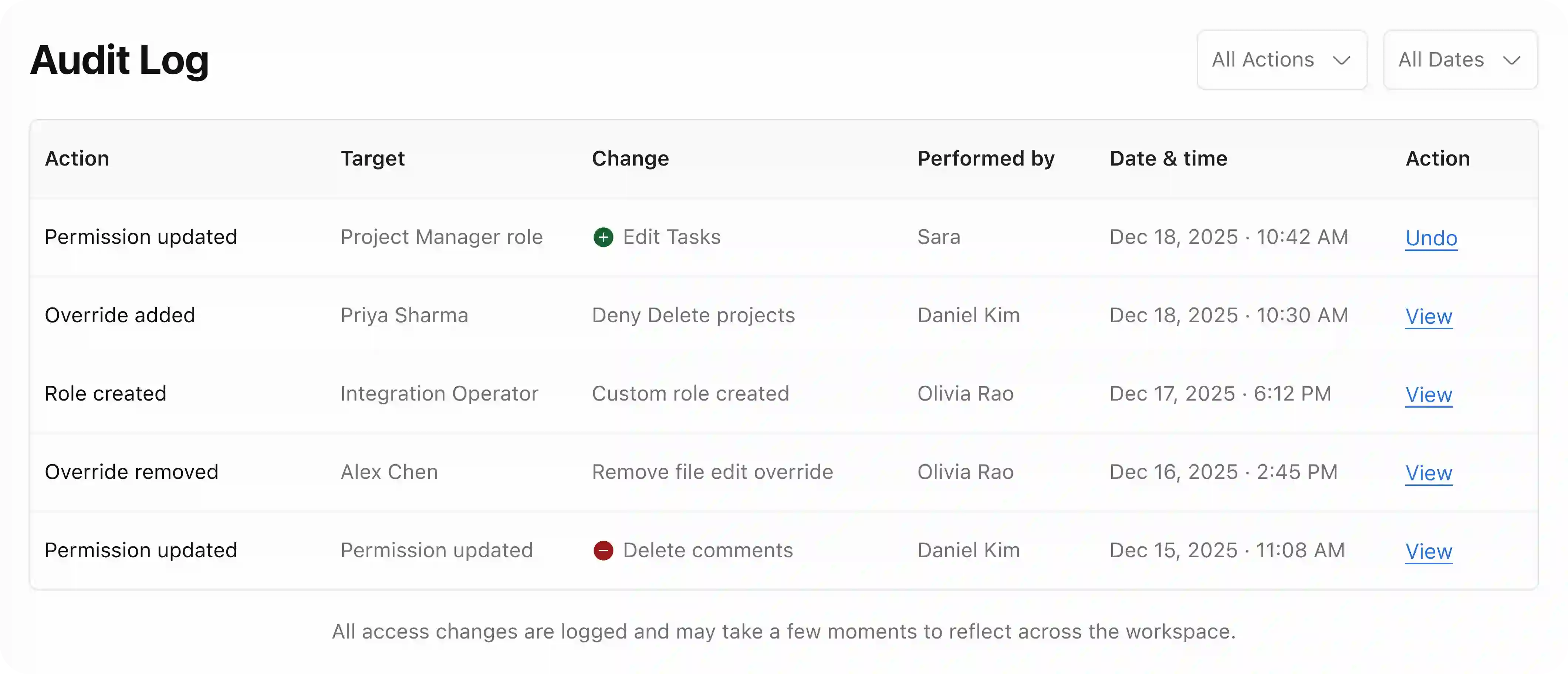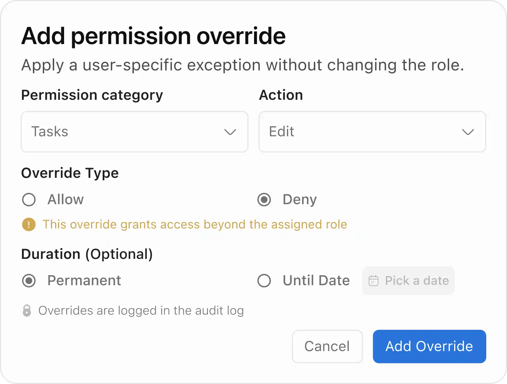 User-level exceptions that sit above roles, are visually flagged, and fully reversible. Admins can apply them permanently or set an expiry date — keeping edge cases handled cleanly without polluting the shared role structure.