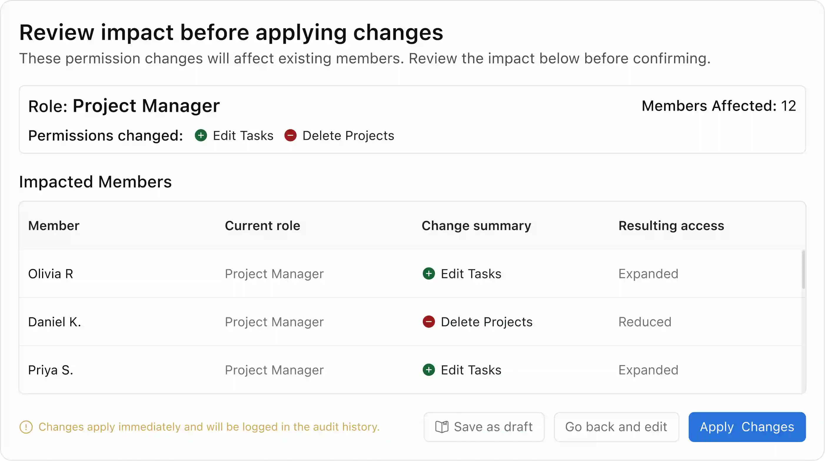 Before any change applies, admins see exactly which members are affected and how. It's not a confirmation dialog — it's a decision surface. The framing shifts from "save?" to "here’s what happens to real people."