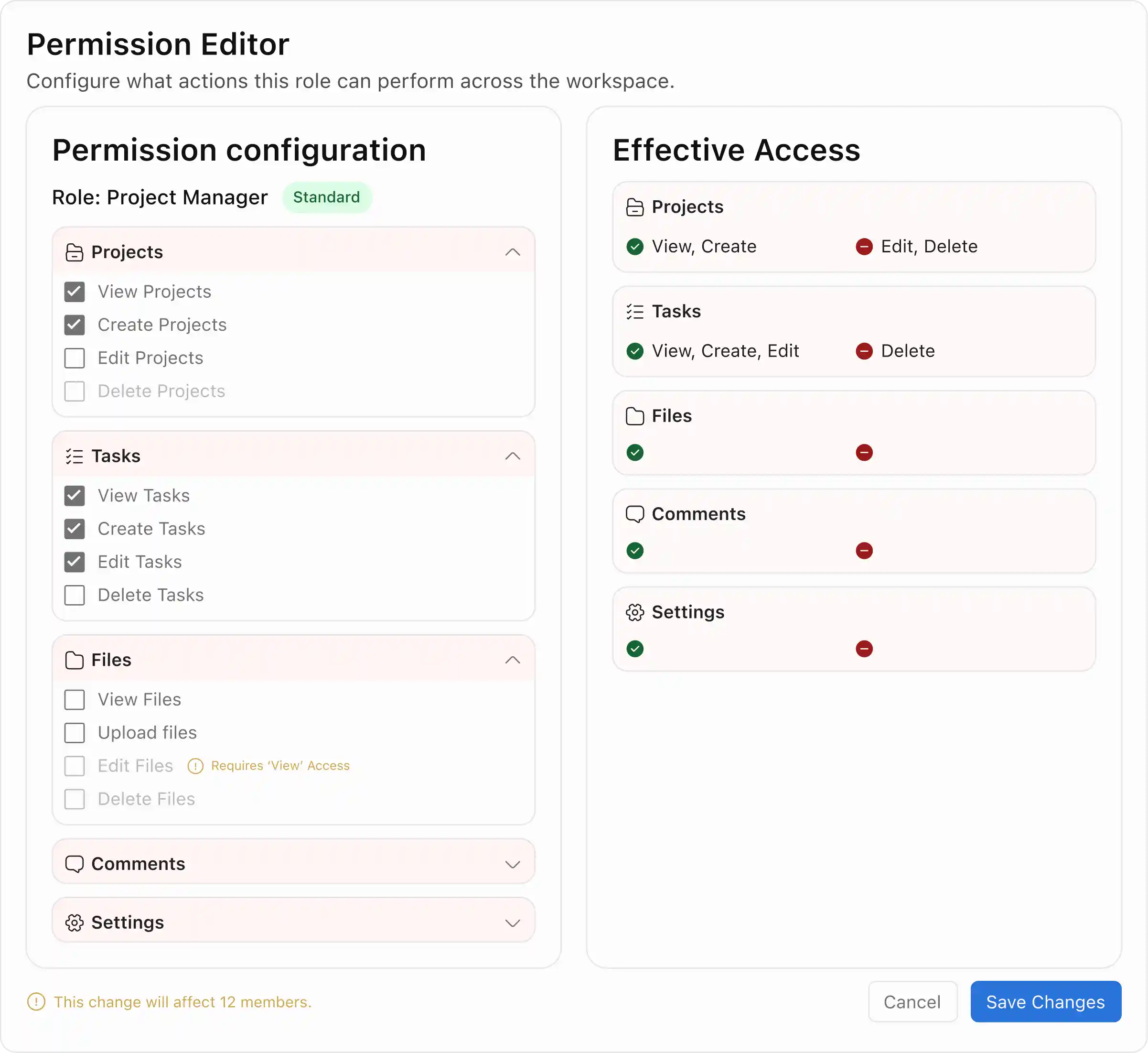 Permissions are grouped by domain. Dependency rules (Delete requires Edit, Edit requires View) are enforced by construction — invalid states can't be reached. A live Effective Access panel updates in real time.
